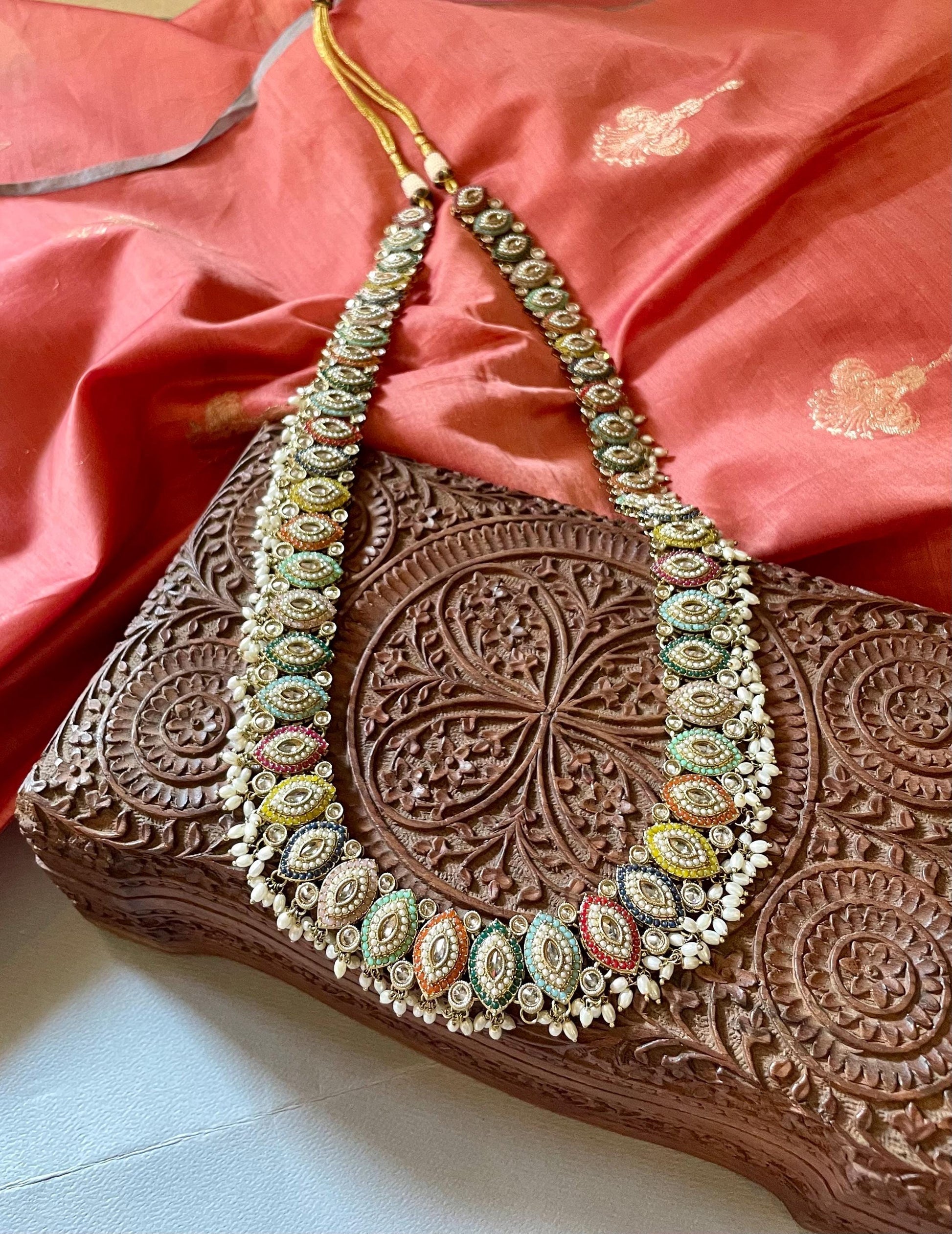 This glamorous navratan bridal necklace set is delicately handcrafted with shimmering colourful stones and highlighted with pearls!
