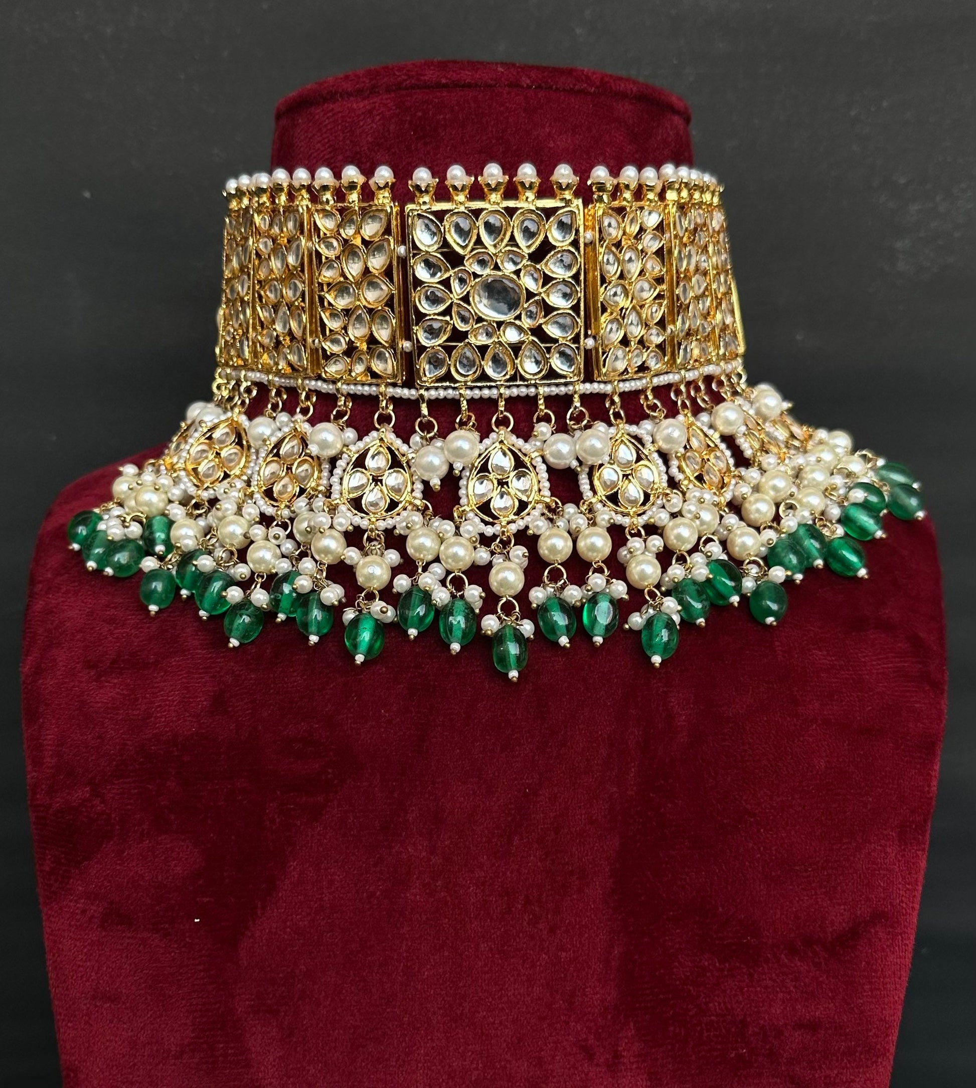 Reflect your aura with this sparkling kundan choker set adorned emerald green beads and faux pearls - symbolizing unique beauty and elegance.