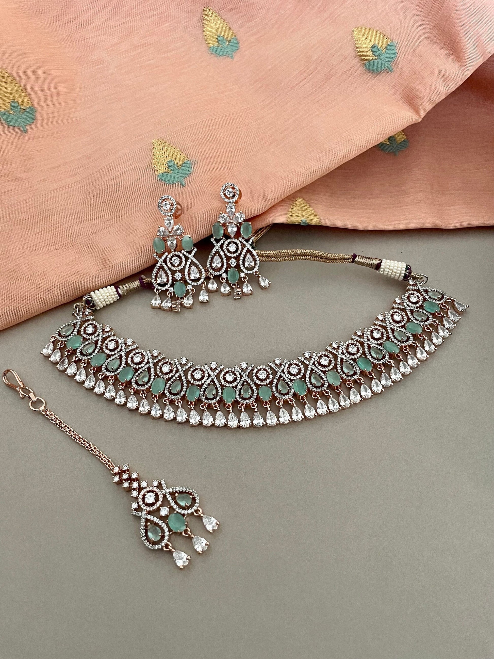 Mintgreen Rosegold Diamond Set/American Diamond Set/Diamond Tika Set/CZ Set/Zicon Jewelry/Indian Jewelry Set/Wedding Set