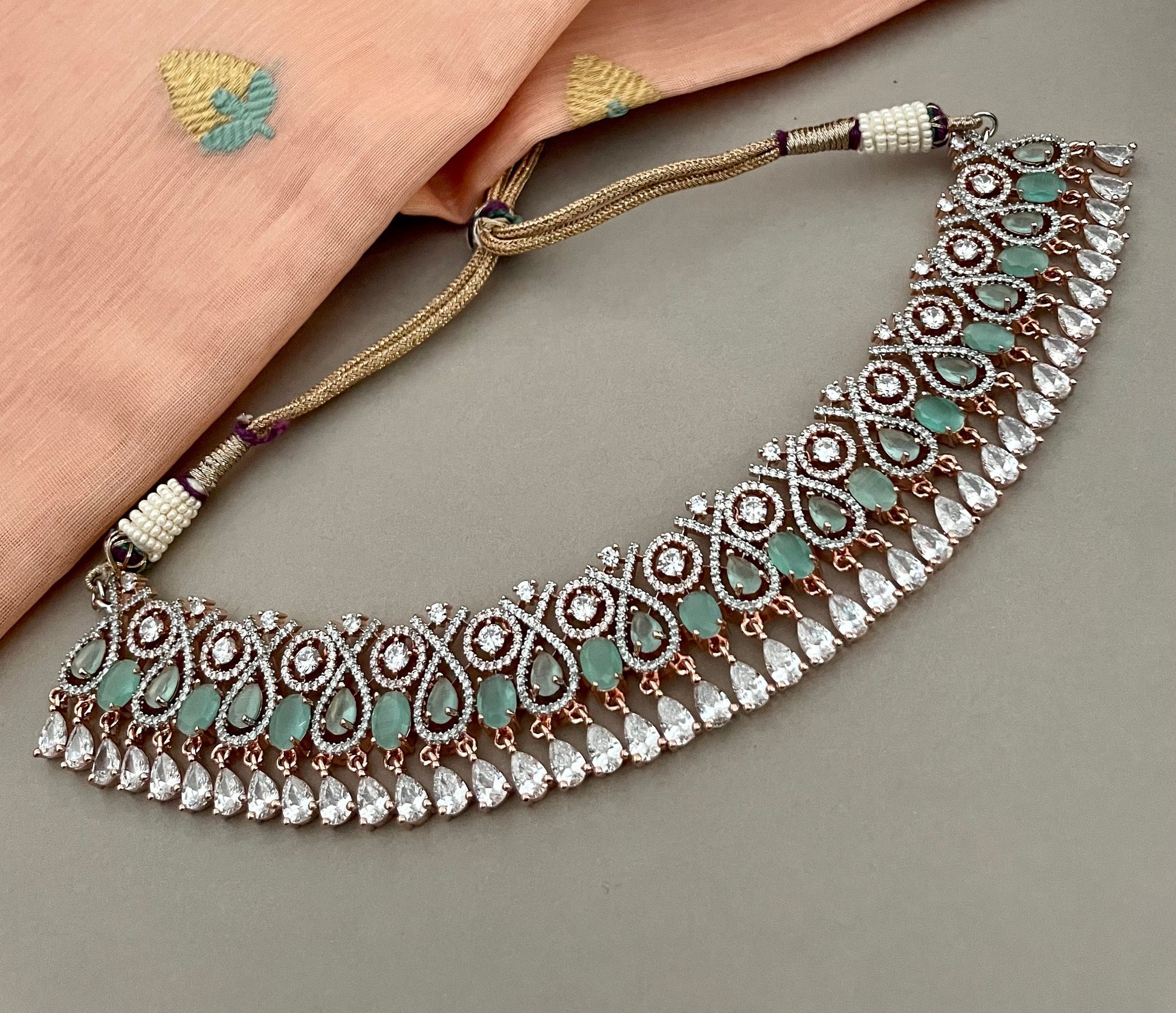 A luxurious and elegant Mintgreen Rosegold Diamond necklace set beautifully crafted with American diamonds and pink stones. Perfect for any occasion.