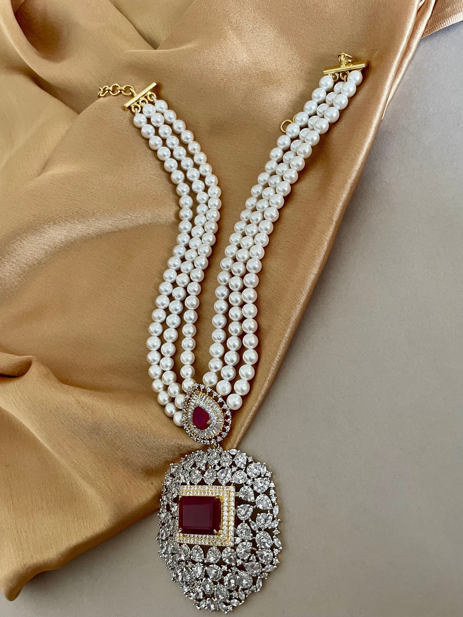 Ruby Red Diamond Set/American Diamond Set/Diamond and Pearls Set/Cocktail Set/CZ Jewelry Set/Cubic Zirconia/Indian Jewelry Set/Wedding Set