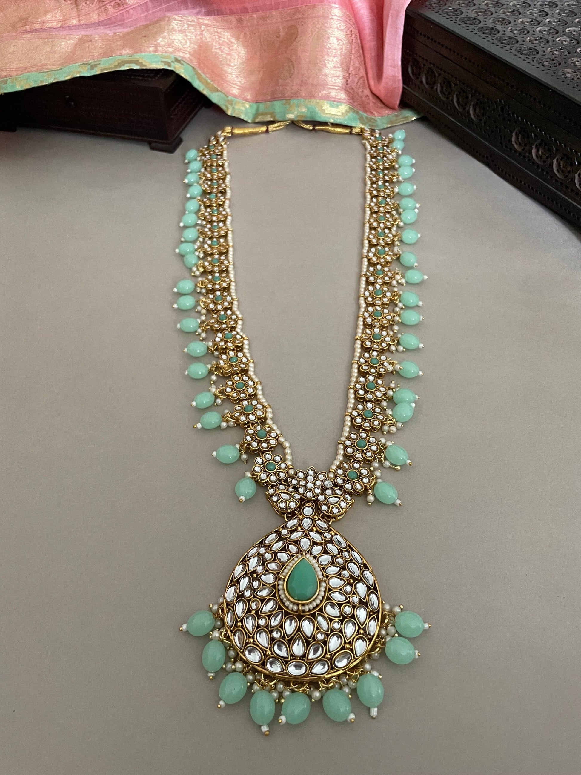 Trendy, eye catching choker and long necklace set is handcrafted with shimmering kundan stones, interlaced with mintgreen beads.